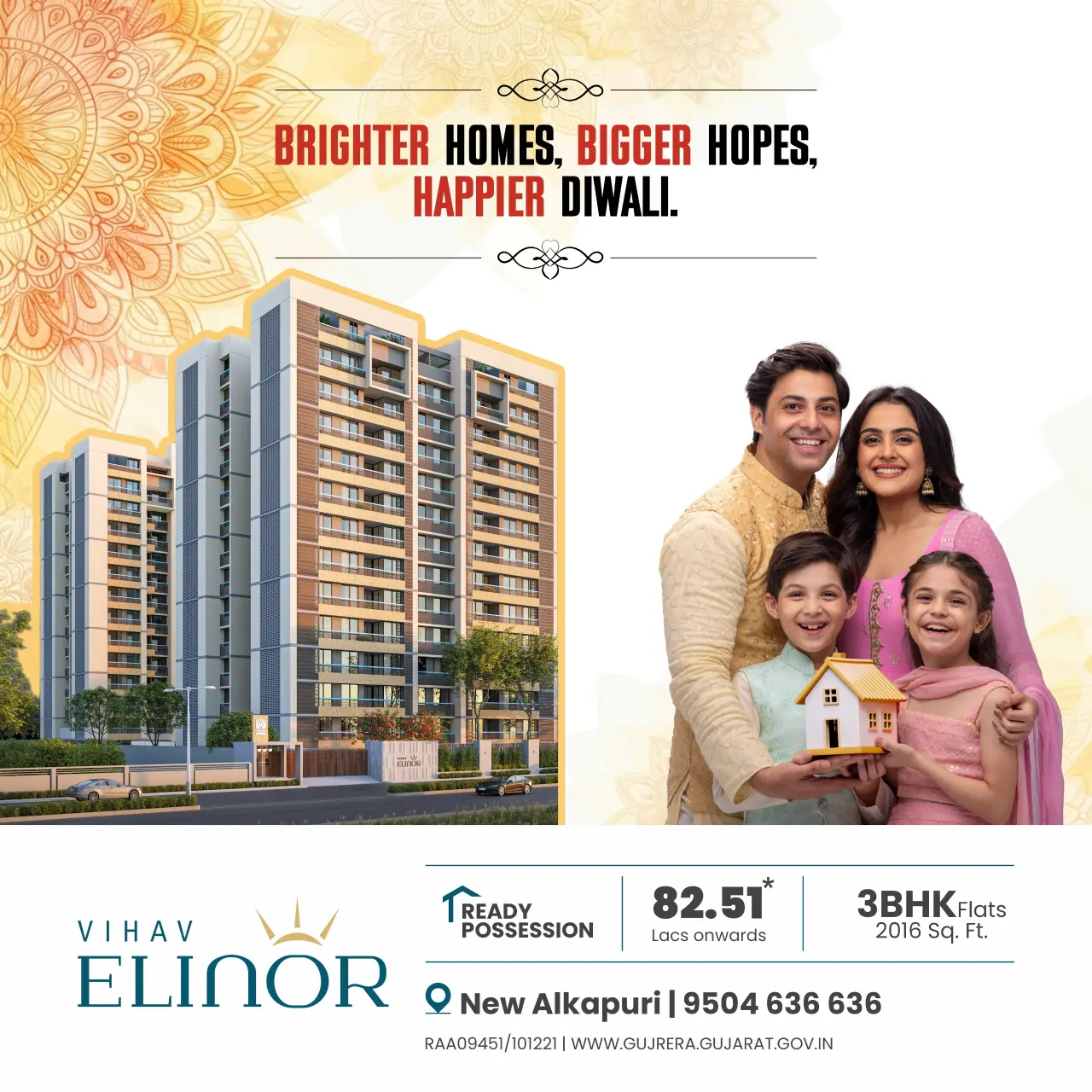 Vihav Elinor is an exclusive residential project offering spacious 3 BHK and 4 BHK flats and 5 BHK penthouses in New Alkapuri, Gotri, Vadodara. Nestled in one of the city’s most prestigious and peaceful neighborhoods, Vihav Elinor is designed for those who seek refined living with space, elegance, and comfort at its core.
