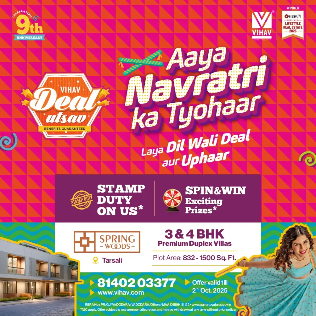 Welcome to Vihav Spring Woods, a thoughtfully planned residential project offering spacious 3 BHK duplex homes in Tarsali, one of the most connected and fast-developing localities in Vadodara. Located close to Makarpura, Manjalpur, Danteshwar, Ghanghretia, and Chikhodara, this gated community provides the ideal setting for families who desire space, comfort, and convenience all in one place.